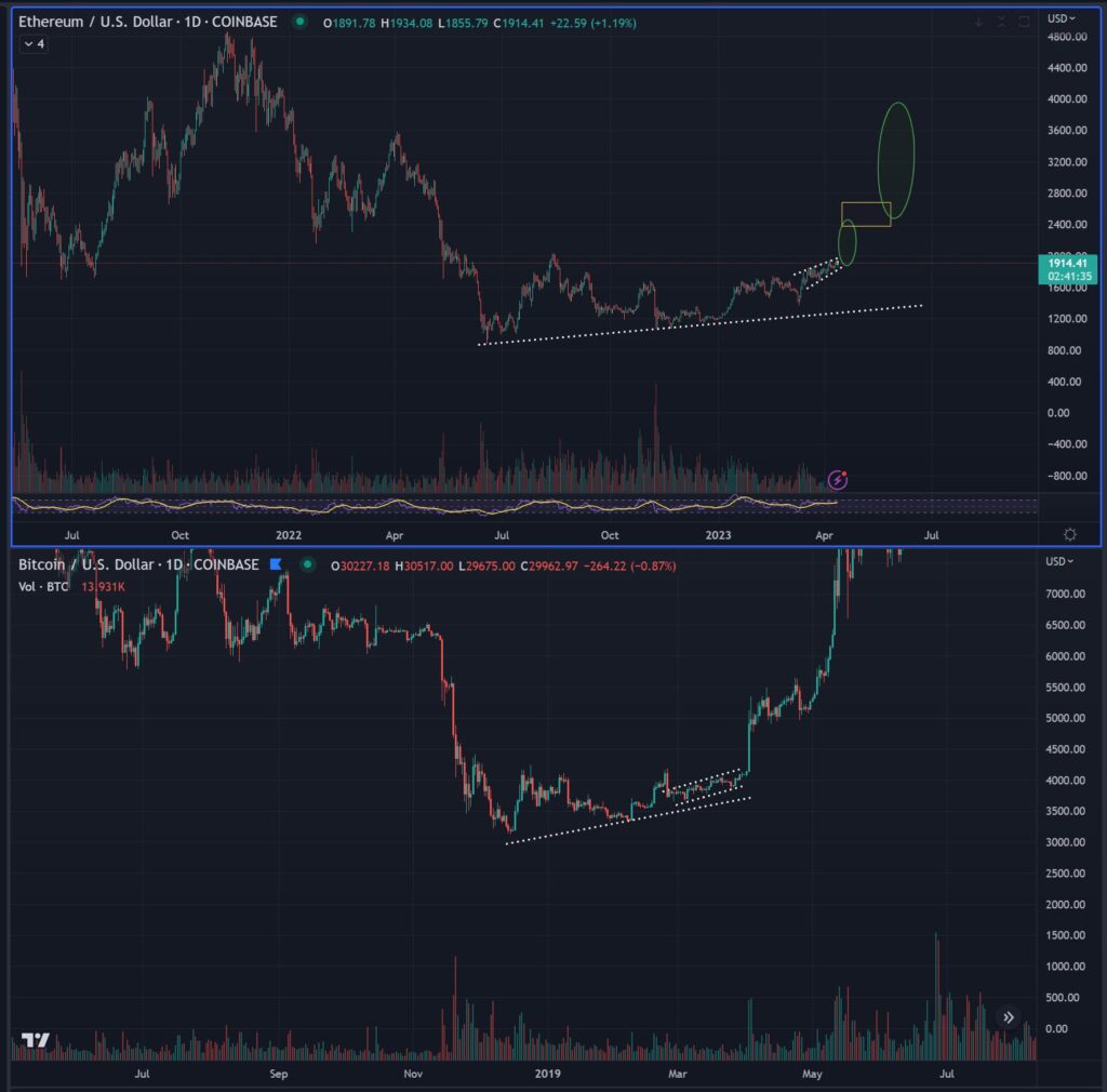Smart Contracter then turns his attention toward the leading smart contract platform Ethereum. According to the trader, the fear surrounding the platform’s new Shanghai update, which now allows users to withdraw their staked ETH, is not warranted. He also believes the top altcoin is flashing vibes of Bitcoin’s price action in 2019 when the crypto king surged by about 300% in a few months.
